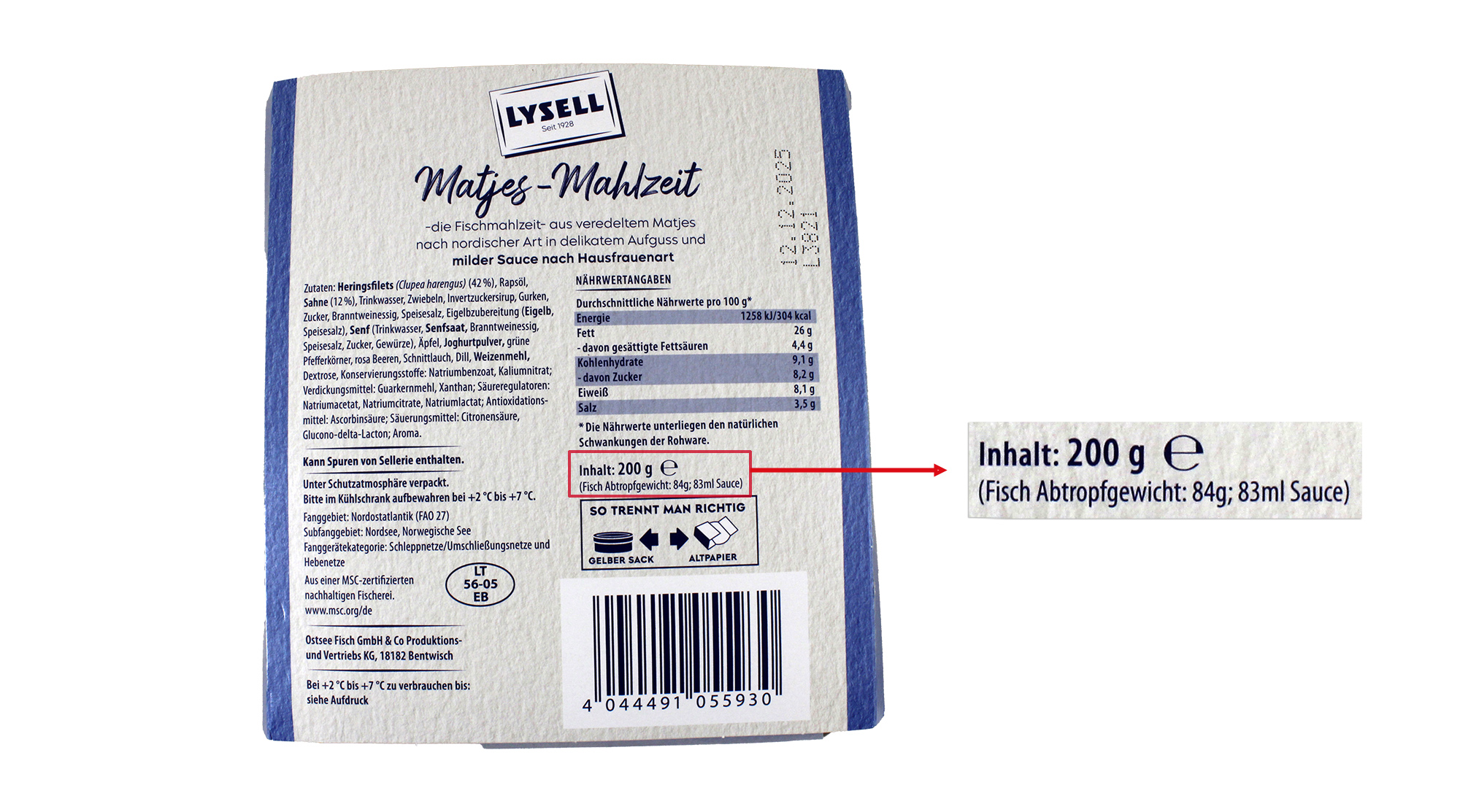 Laut Hersteller enthält die Packung „Lysell Matjes Mahlzeit mit Sauce“ 200 g. Im Kleingedruckten werden 84 g Fisch und 83 ml Soße angegeben, zusammen maximal 167 g, da die Dichte von Mayonnaise unter 1 liegt.