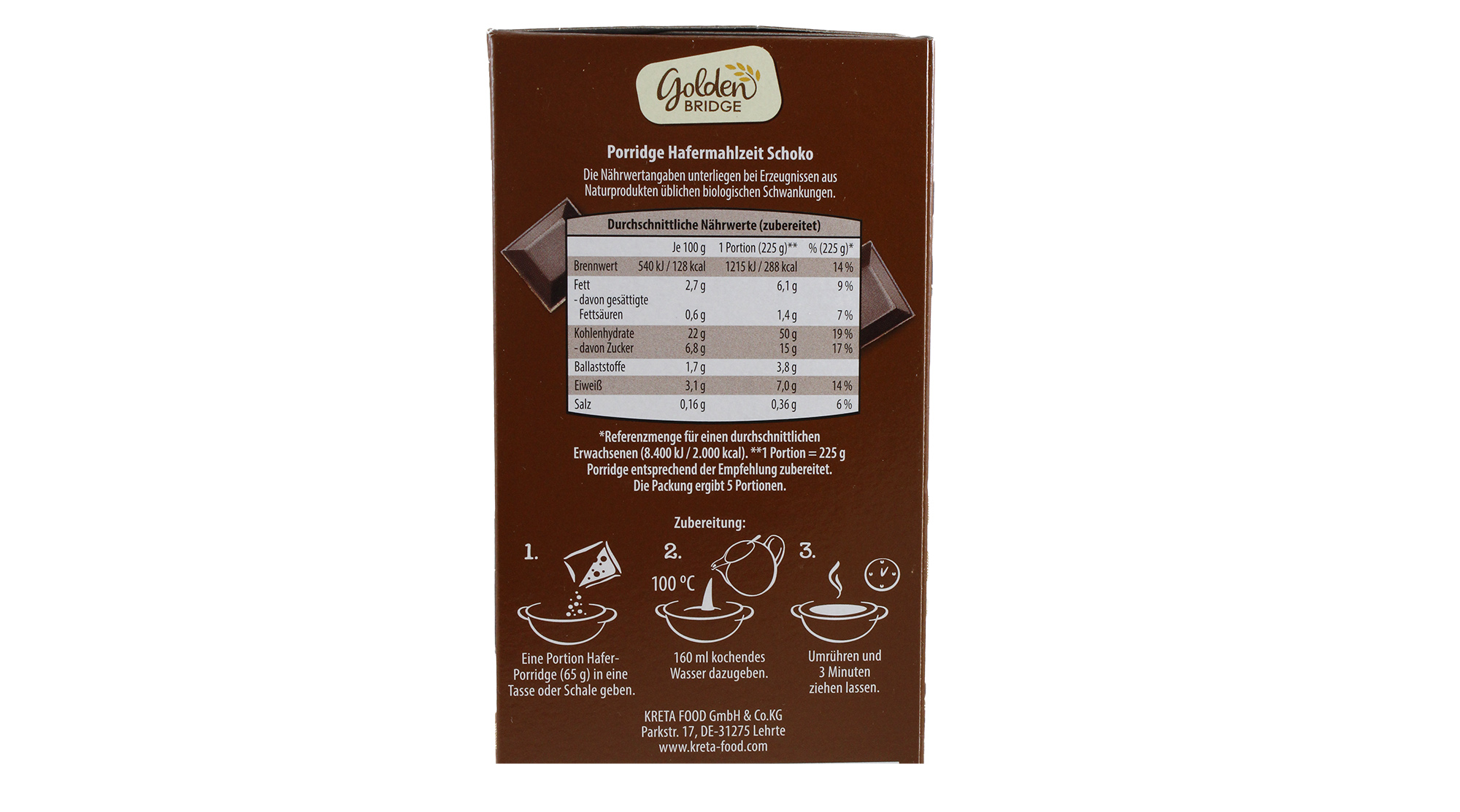 Auf der Verpackung „Golden Bridge Schoko Porridge Hafermahlzeit“ stehen nur die Nährwertangaben „Je 100 Gramm zubereitet“. Da eine Portion aber mit 160 ml Wasser angerührt werden muss, liegt der tatsächliche Wert aller Inhaltsstoffe wie Zucker, Kohlenhydrate natürlich auf 100 Gramm vom Inhalt deutlich höher. Hätte ich das vorher gesehen, aber es ist so klein geschrieben auf der Rückseite, dass man es selbst mit Brille kaum lesen kann, hätte ich es nicht gekauft.