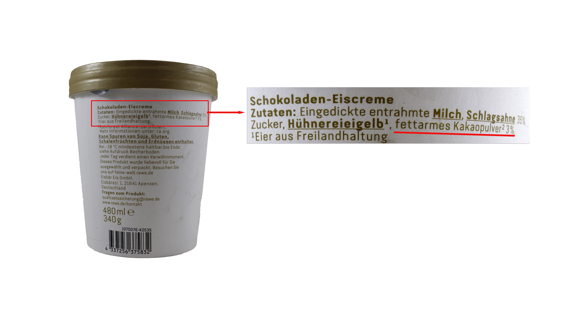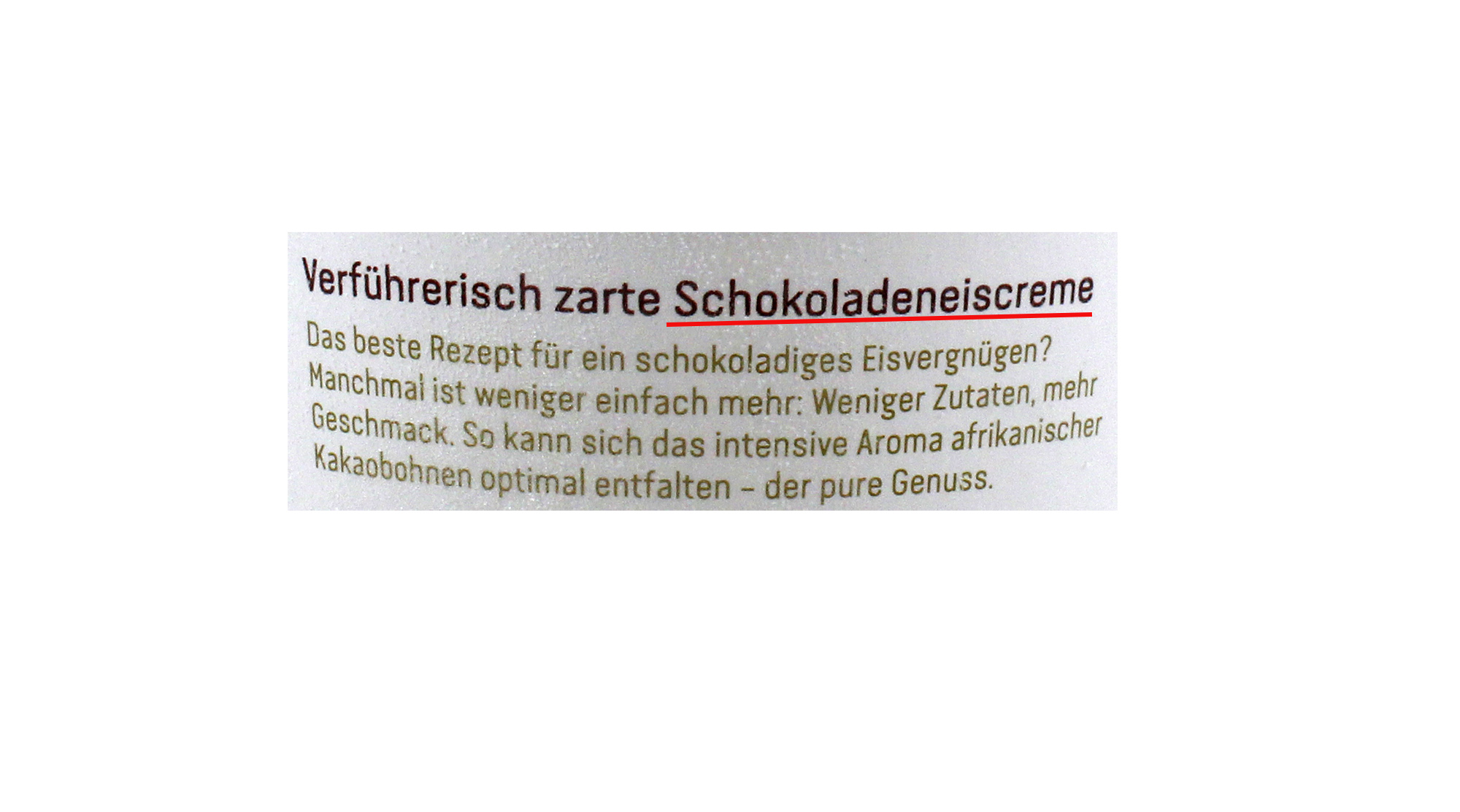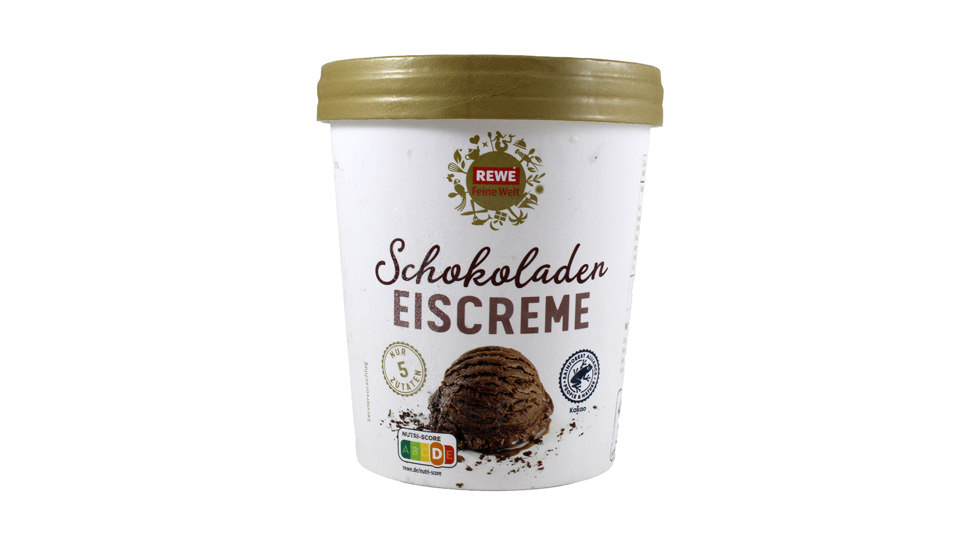 Rewe bietet „Schokoladen-Eiscreme“ unter der Eigenmarke „Rewe Feine Welt“ an. Die Schauseite hebt „Schokolade“ dabei durch den Kursivdruck und die dunkelbraune Farbe des Schriftzuges besonders hervor. Zusätzlich wirbt die Becherseite mit „verführerisch zarte Schokoladeneiscreme“ und „schokoladiges Eisvergnügen“. Das Zutatenverzeichnis führt „fettarmes Kakaopulver 3 %“ auf, jedoch keine „Kakaobutter“ oder „Schokolade“.