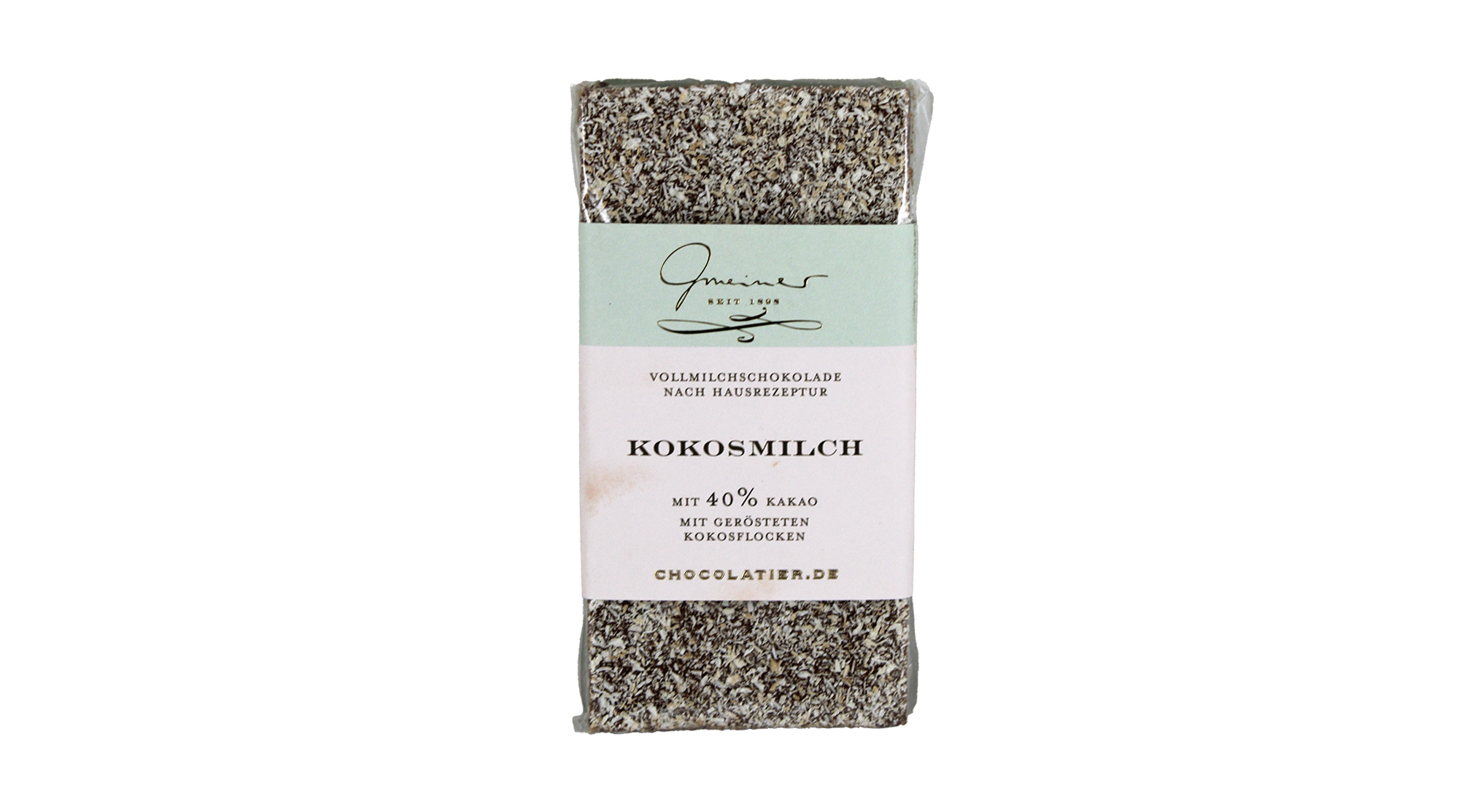 Auf der Schauseite der Schokoladentafel der Confiserie Gmeiner springt der groß geschriebene Produktname „Kokosmilch“ ins Auge. Darüber steht der Hinweis „Vollmilchschokolade nach Hausrezeptur“ und darunter der Hinweis „Mit 40 % Kakao. Mit gerösteten Kokosflocken“. Durch die oben und unten durchsichtige Verpackung ist eine dicht mit Kokosraspeln bestreute Tafel Schokolade zu sehen. Auf der Rückseite der Banderole lautet die Bezeichnung „Kokosmilch – Vollmilchschokolade mit Kokosflocken (7 %). Mit Kakao: 40 % mindestens“. In der Zutatenliste stehen nur Kokosflocken als Zutat, aber keine Kokosmilch.