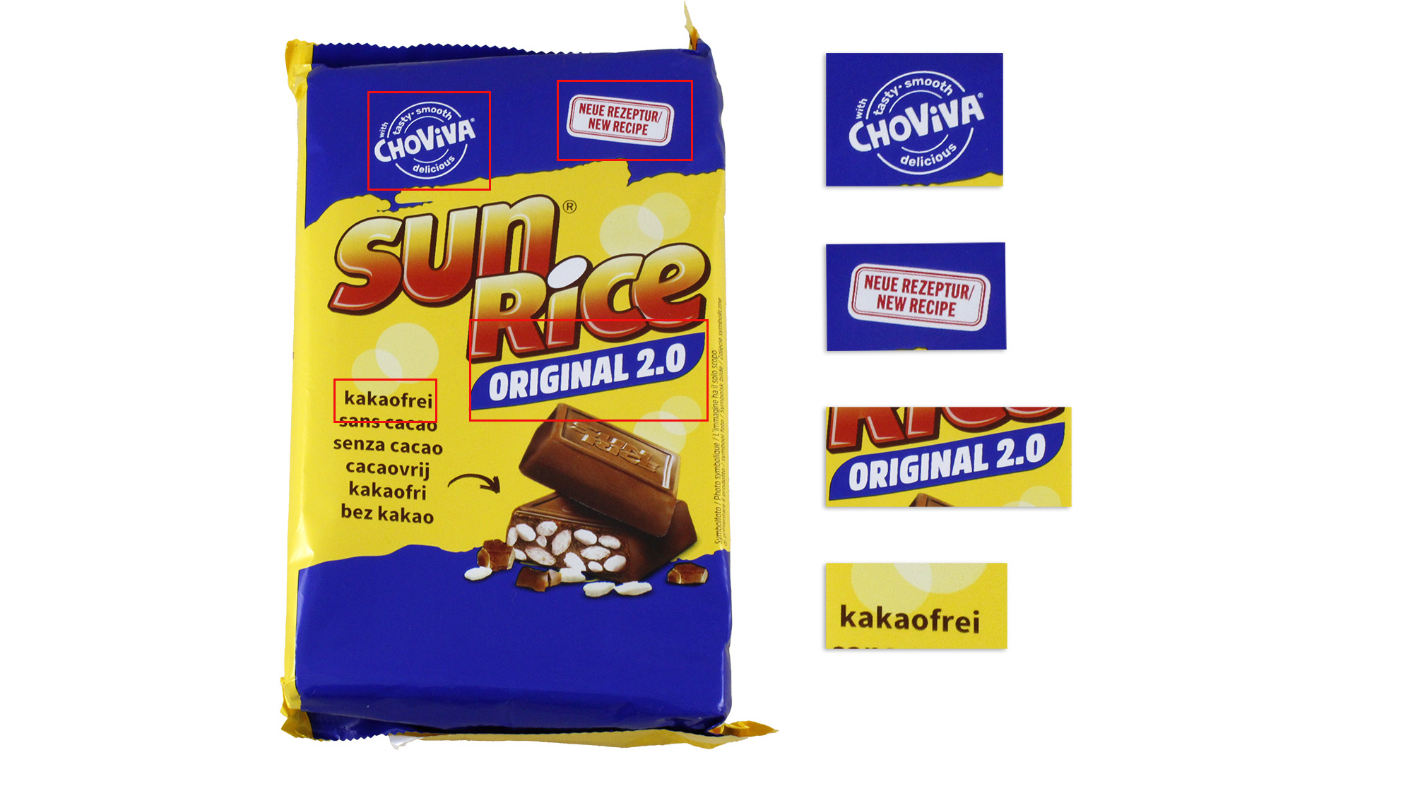 Die Knusperriegel „Sun Rice“ bietet die Anbieterfirma neu als „Sun Rice Original 2.0“ an. Die Größe der Verpackung, die farbliche Gestaltung und die Schriftart und -größe sind ebenso wie die Abbildung der Riegel unverändert. Daneben steht der Hinweis „kakaofrei“ in sechs Sprachen. Deutlich kleiner als der Produktname sind oben auf der Schauseite ein siegel-ähnlicher Hinweis „with tasty smooth Choviva CO2 reduced“ und der Hinweis „Neue Rezeptur“ in Deutsch und Englisch zu sehen.