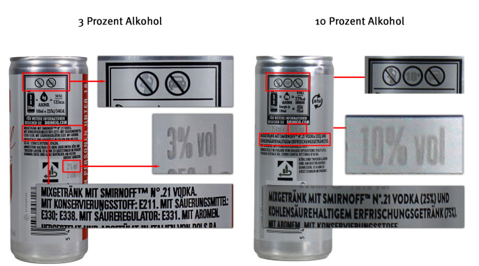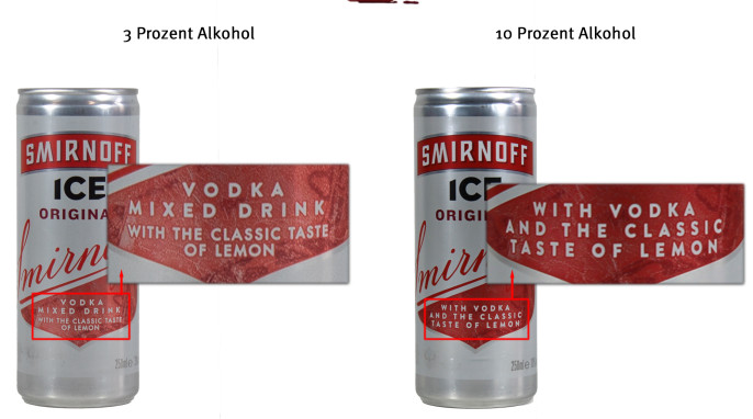 Diageo bietet das Mixgetränk „Smirnoff Ice Original“ in der Dose zeitgleich mit unterschiedlicher Rezeptur in nahezu identischer Aufmachung an. Obwohl die Dosen denselben Produktnamen und dasselbe Design haben, enthält eine Variante deutlich mehr Wodka und damit 10 gegenüber 3 Volumenprozent Alkohol.