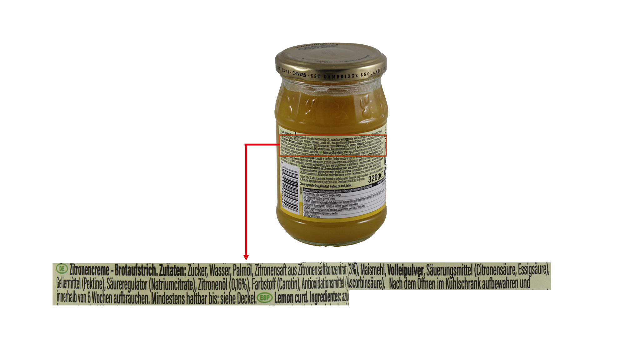 Der Anbieter vertreibt das Produkt „Lemon Curd“ unter der Marke „Chivers“ mit den Hinweisen „Est Cambridge England 1873“ sowie „150 years of the finest English fruit spreads“. Abgebildete Zutaten sind Zitronen.