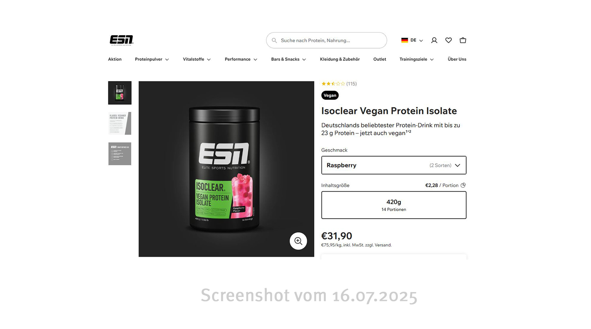 Die Firma Fitmart bietet auf ESN.com Proteinpulver an, darunter das Produkt „Isoclear Vegan Protein Isolate“. Neben dem Produktnamen ist auf der Dose die Sortenbezeichnung „Raspberry flavor“ genannt, jedoch in deutlich kleinerer Schriftgröße. Zusätzlich ist auf der Dose ist ein rosafarbenes Getränk mit Himbeerfrüchten in einem Glas abgebildet. Laut Zutatenliste enthält das Produkt keine „Himbeeren“ oder Bestandteile daraus. Neben hydrolisiertem Erbsenprotein, Aminosäuren und Süßungsmitteln, enthält das Pulver „Aroma“ und „Rote Beete Pulver“.