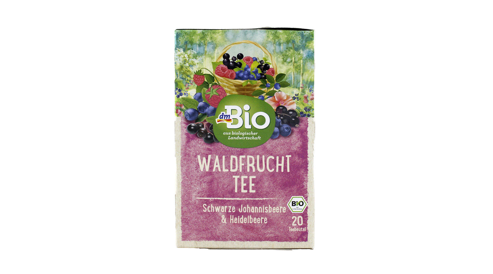 Der Drogeriemarkt dm bietet „Bio Waldfrucht Tee“ mit der Ergänzung „Schwarze Johannisbeere & Heidelbeere“ an. Die Abbildung auf der Schauseite zeigt schwarze Johannisbeeren, Heidelbeeren, Himbeeren und dazwischen leicht verdeckt eine rosafarbene Blüte. Die Zutatenliste führt „32 % Hagebuttenschalen, 26 % Hibiskusblüten, Äpfel, Orangenschalen, 7 % schwarze Johannisbeeren, 6 % Heidelbeeren, 3 % Holunderbeeren, 2 % Himbeeren“ auf. Die Bezeichnung auf der Verpackungsseite lautet „Bio Früchtetee“.