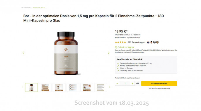 Die Firma Nutrinem hat eine Werbung zu vermeintlichen Vorteilen von Bor aus dem Online-Angebot entfernt. Die Werbung zu „schwachen Knochen“ und zur „Kundenumfrage“ ist am 11.06.2025 unverändert vorhanden. Lebensmittelklarheit hat die zuständige Lebensmittelüberwachung über die Dosierung des Produktes und Werbung für das Produkt informiert.