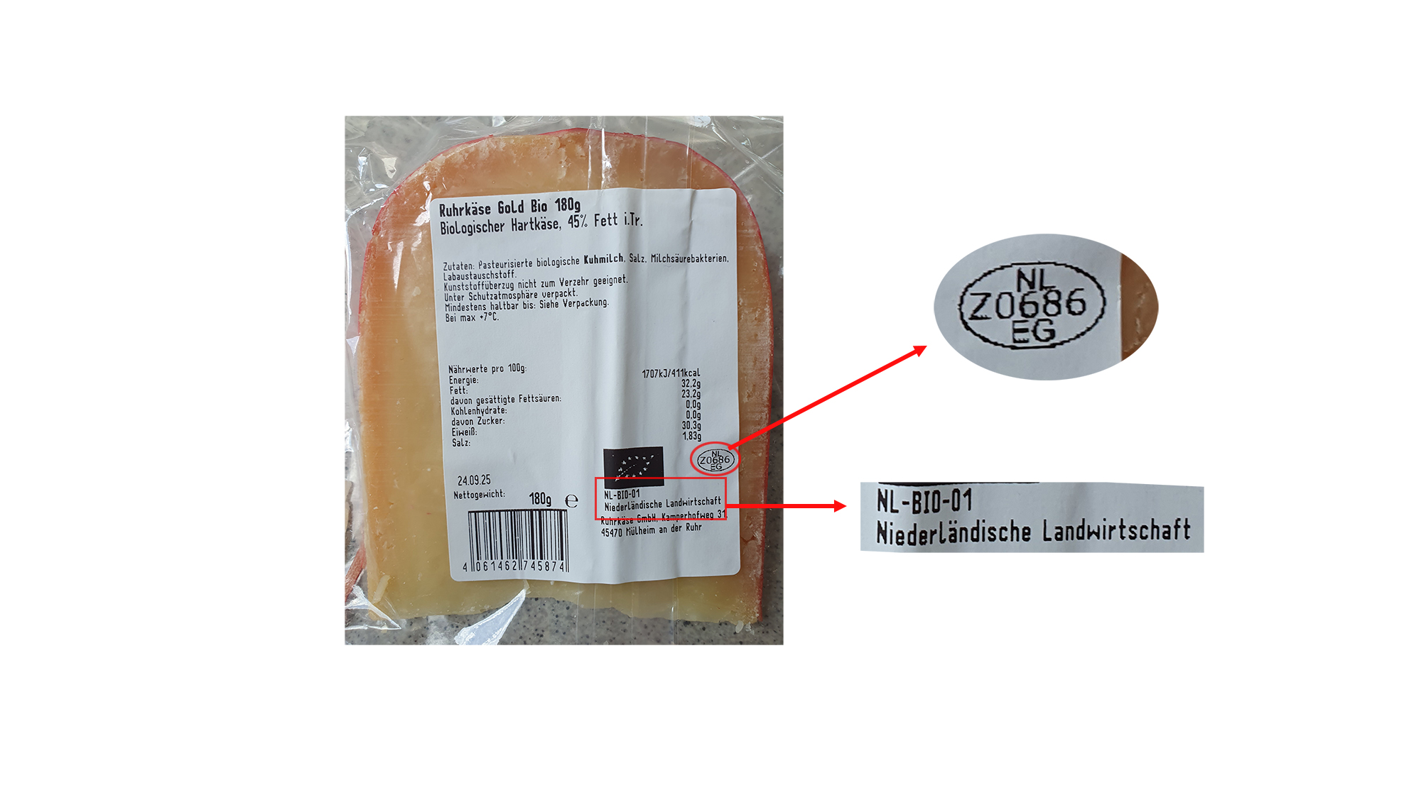 Auf der Rückseite steht als Firmenadresse die Ruhrkäse GmbH in Mülheim an der Ruhr. Weiterhin ist das EU-Bio-Siegel zu sehen, das durch die Nummer der Öko-Kontrollstelle „NL-Bio-01“ und den Hinweis „Niederländische Landwirtschaft“ ergänzt wird. Das Identitätskennzeichen enthält ebenfalls das Länderkürzel NL für die Niederlande.