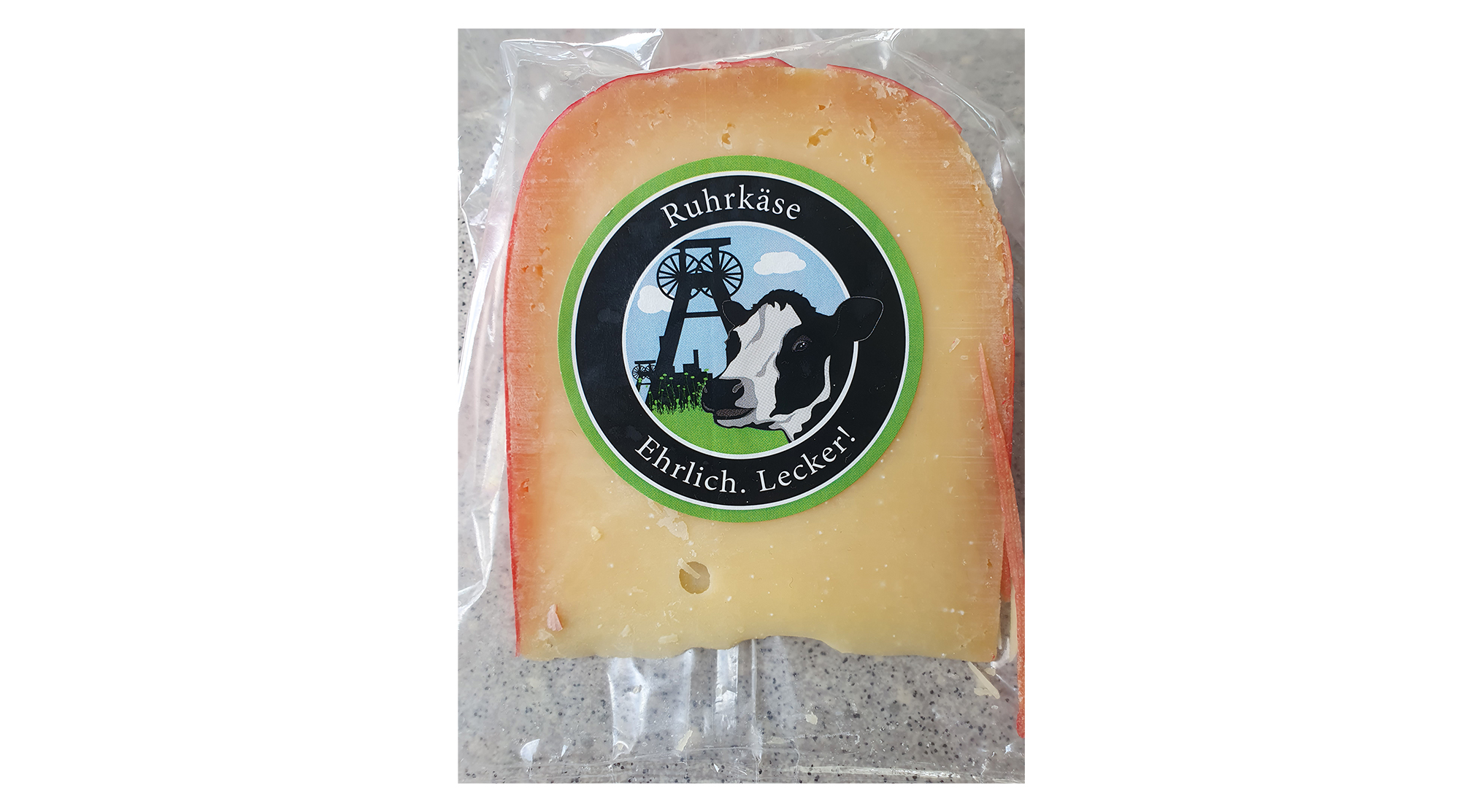 Das Produkt wird als Ruhrkäse vermarktet, abgebildet ist eine Kuh vor einem ruhrge-bietstypischen Förderturm. Der Käse wird allerdings in den Niederlanden produziert.