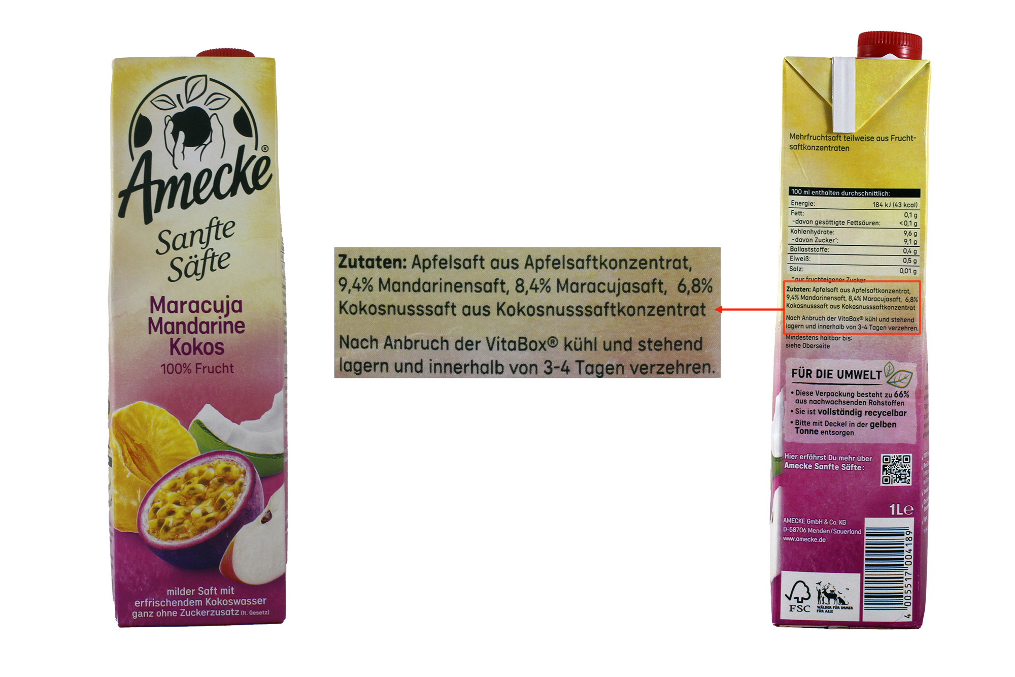 Amecke bietet Mehrfruchtsäfte mit dem Namen „Sanfte Säfte“ an. Die Sorten heißen „Maracuja Mandarine Kokos“, „Himbeer Johannisbeer Apfel“ oder „Erdbeere-Apfel“. Die Abbildungen auf der Schauseite zeigen jeweils prominent die genannten Früchte. Im Verhältnis dazu sind Äpfel weniger gut wahrnehmbar. Der Gehalt für Apfelsaft liegt zwischen 75 und 90 Prozent.