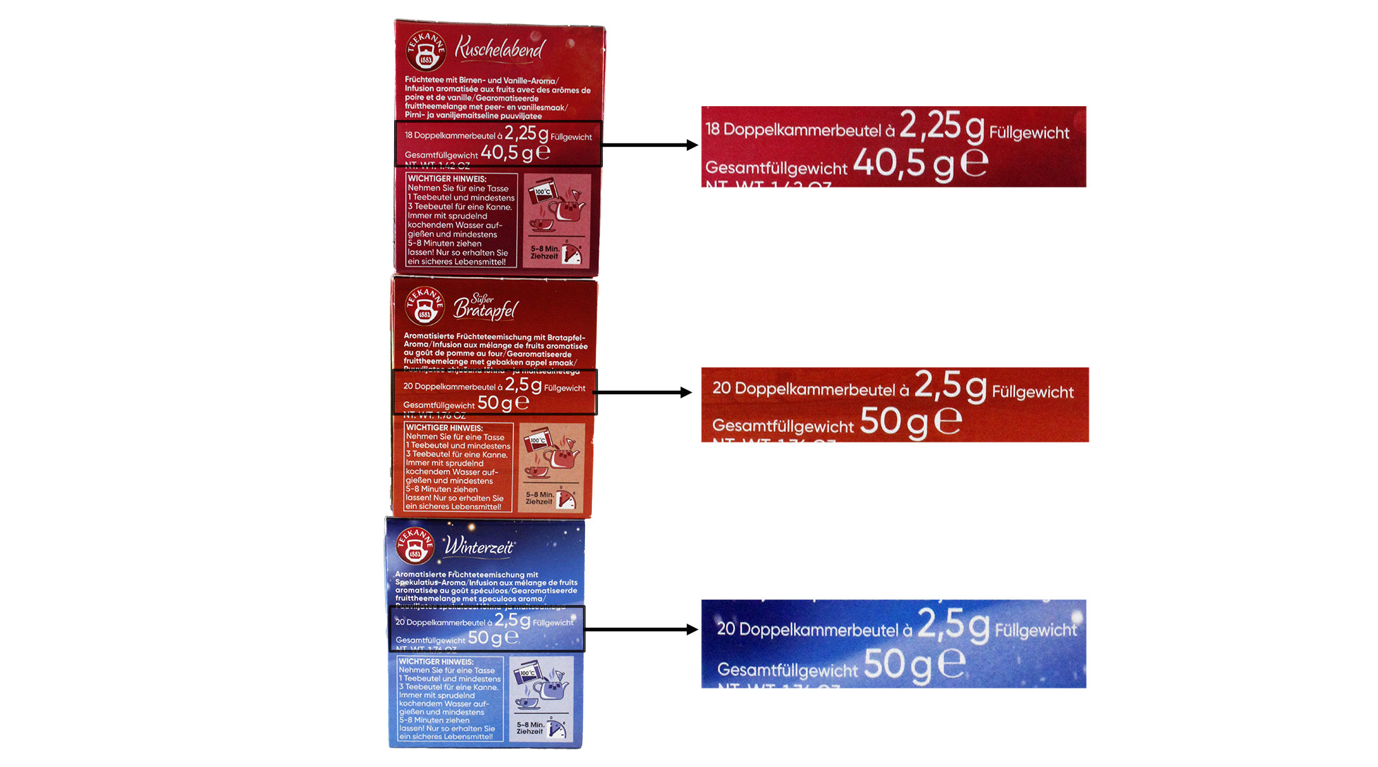 Teekanne sollte bei neuen Sorten auf den ersten Blick darauf hinweisen, wenn die Füllmenge gegenüber vergleichbaren Teesorten geschrumpft ist.