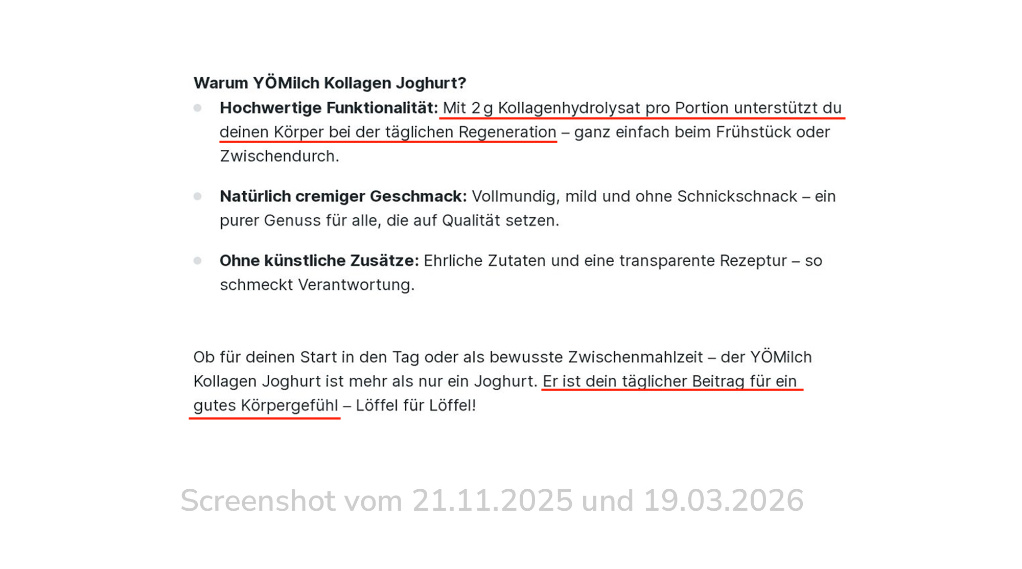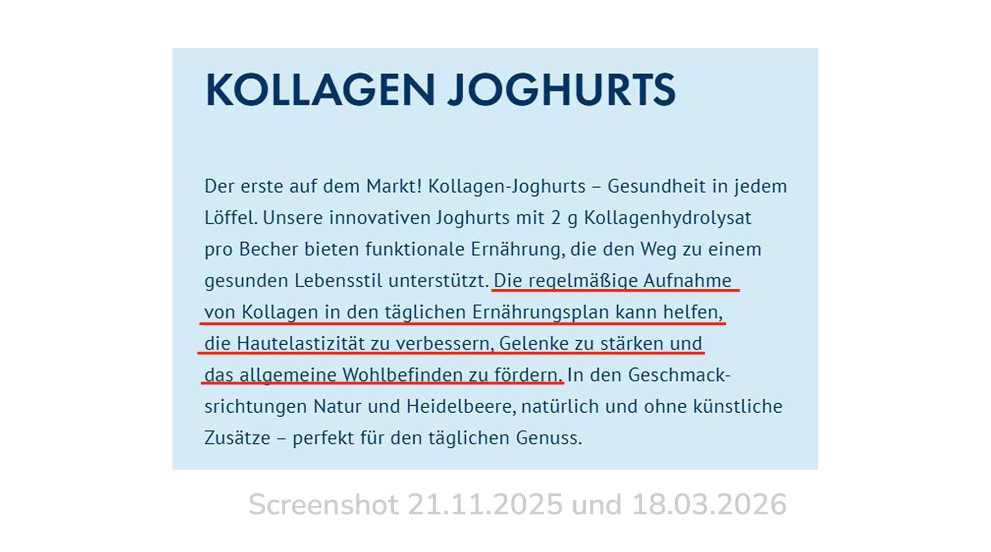 Die im November 2025 angekündigte umgehende Änderung der Werbung ist im März 2026 nach wie vor nicht erfolgt. Das Unternehmen sollte jegliche gesundheitsbezogene Werbung für das Kollagen im Joghurt unterlassen.