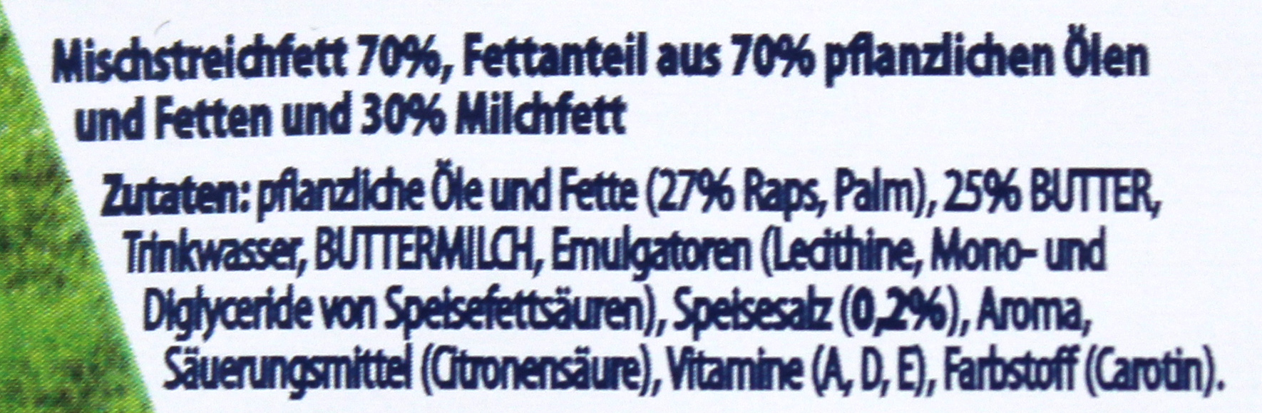Die Verpackungsseiten beschreiben das Produkt als „Brotaufstrich mit Rapsöl und 25 % Butter“. Auf der Rückseite steht die Bezeichnung „Mischstreichfett 70 %, Fettanteil mit 70 % pflanzlichen Ölen und Fetten und 30 % Milchfett“ sowie die Zutatenliste. Sie listet „pflanzliche Öle und Fette (27 % Raps, Palm), 25 % Butter, Trinkwasser“ sowie weitere Zutaten auf.