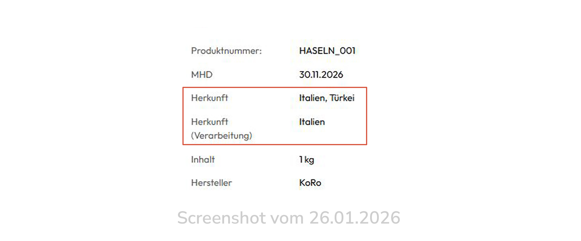 Die Firma Koro bezeichnet ihre Haselnusskerne auf der Produktabbildung im Shop als „Runde Römer“. Sie weist damit auf Italien als Herkunftsland der Nüsse. Außer Italien nennt die Firma allerdings für dasselbe Angebot auch die Türkei. Solche Angaben sind widersprüchlich.