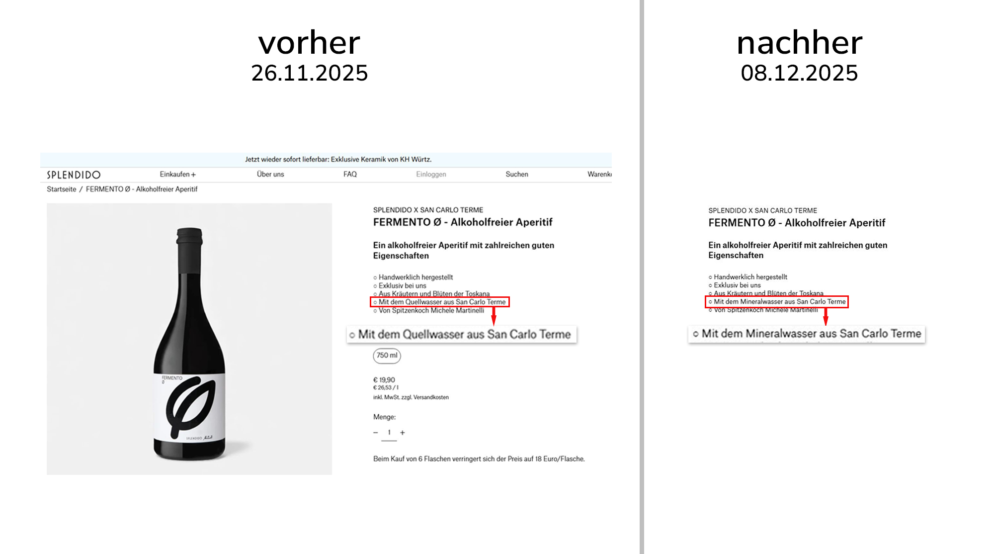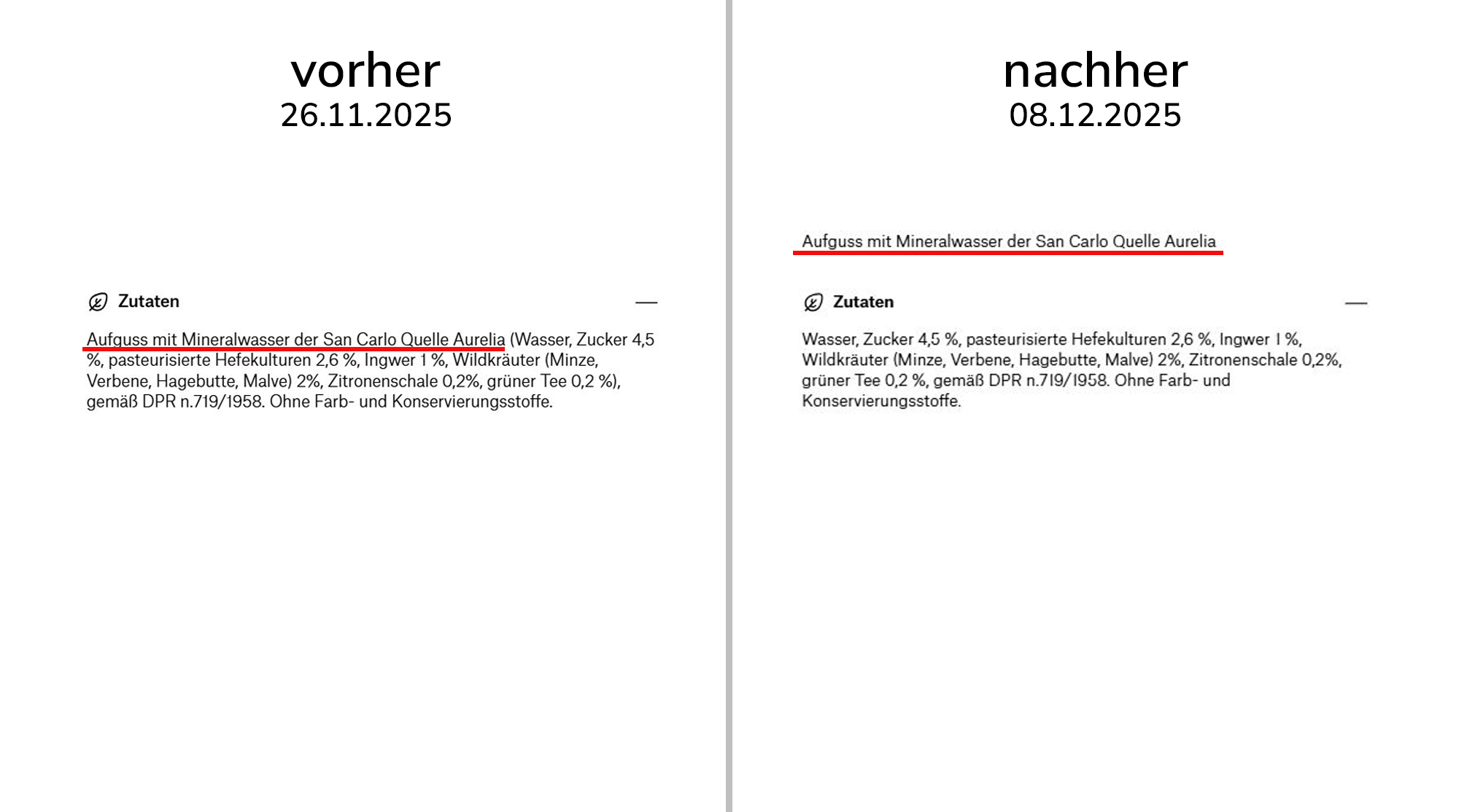 Das verwendete Wasser ist ein in der EU amtlich anerkanntes natürliches Mineralwasser (Richtlinie 2009/54/EG). Der Vorwurf der falschen Bezeichnung ist damit unbegründet. Wir haben jedoch die inkonsistente Nutzung der Begriffe „Quellwasser“ und „Mineralwasser“ korrigiert, um Missverständnisse auszuschließen. Gesundheitsbezogene Aussagen wurden entfernt und die Zutatenliste formal an die gesetzlichen Vorgaben angepasst.