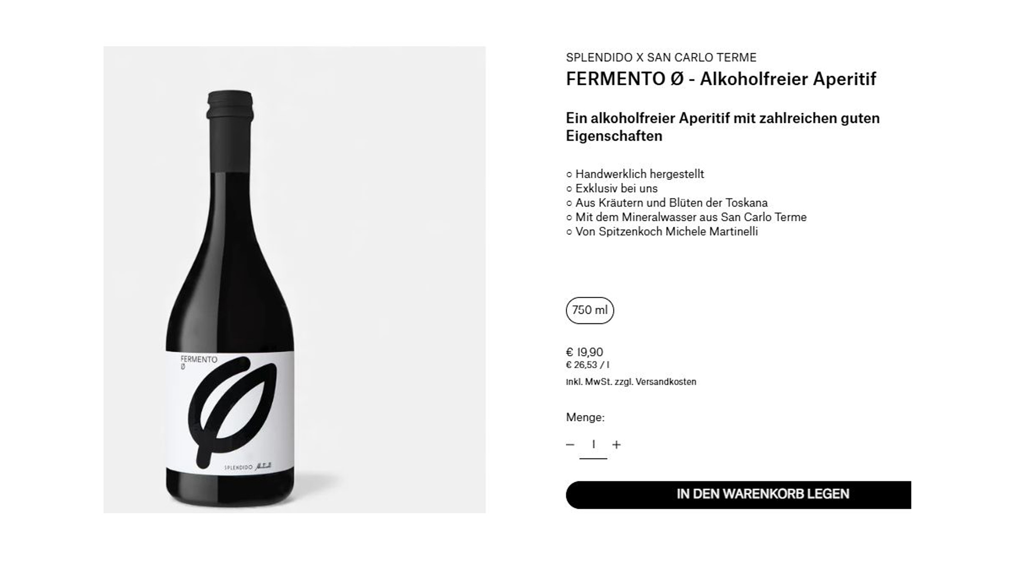 Der Händler vertreibt über seinen Shop Splendido-magazin.de das Produkt „Fermento“. Außerdem wirbt er mit „Ø Alkoholfreier Aperitif“. Weitere Angaben zum Getränk sind „Aus Kräutern und Blüten der Toskana“ sowie „Mit dem Quellwasser aus San Carlo Terme“.