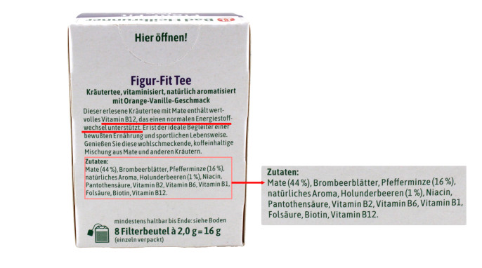 In einem Fließtext erläutert der Anbieter weiterhin „enthält wertvolles Vitamin B12, das einen normalen Energiestoffwechsel unterstützt“ und „wohlschmeckende, koffeinhaltige Mischung aus Mate und anderen Kräutern“.