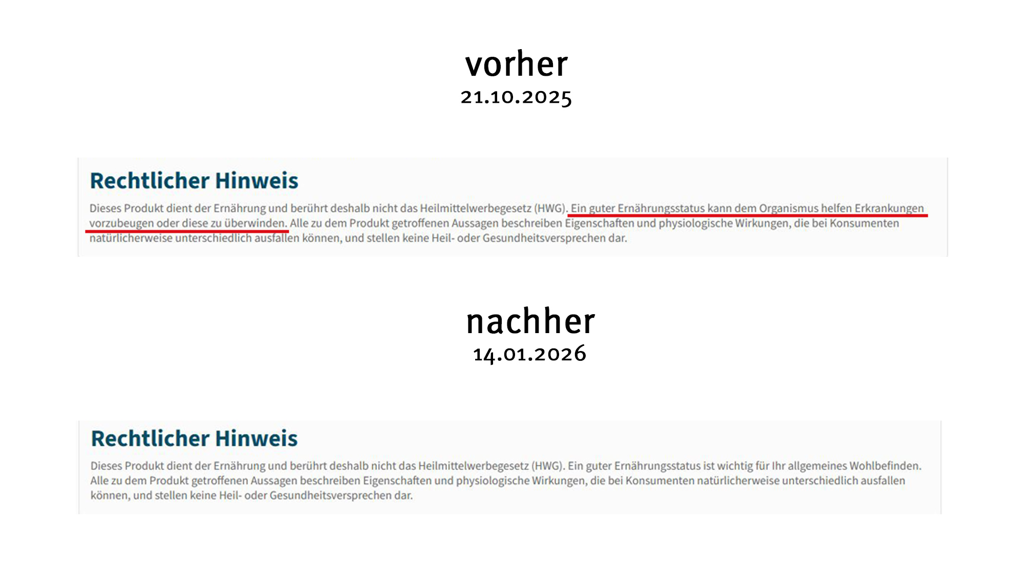 Der Anbieter hat die Abbildung mit den kritisierten Natürlich-Aussagen im Online-Shop entfernt. Außerdem hat er den Absatz zur Krankheitsvorbeugung unter der Überschrift „rechtlicher Hinweis“ geändert.