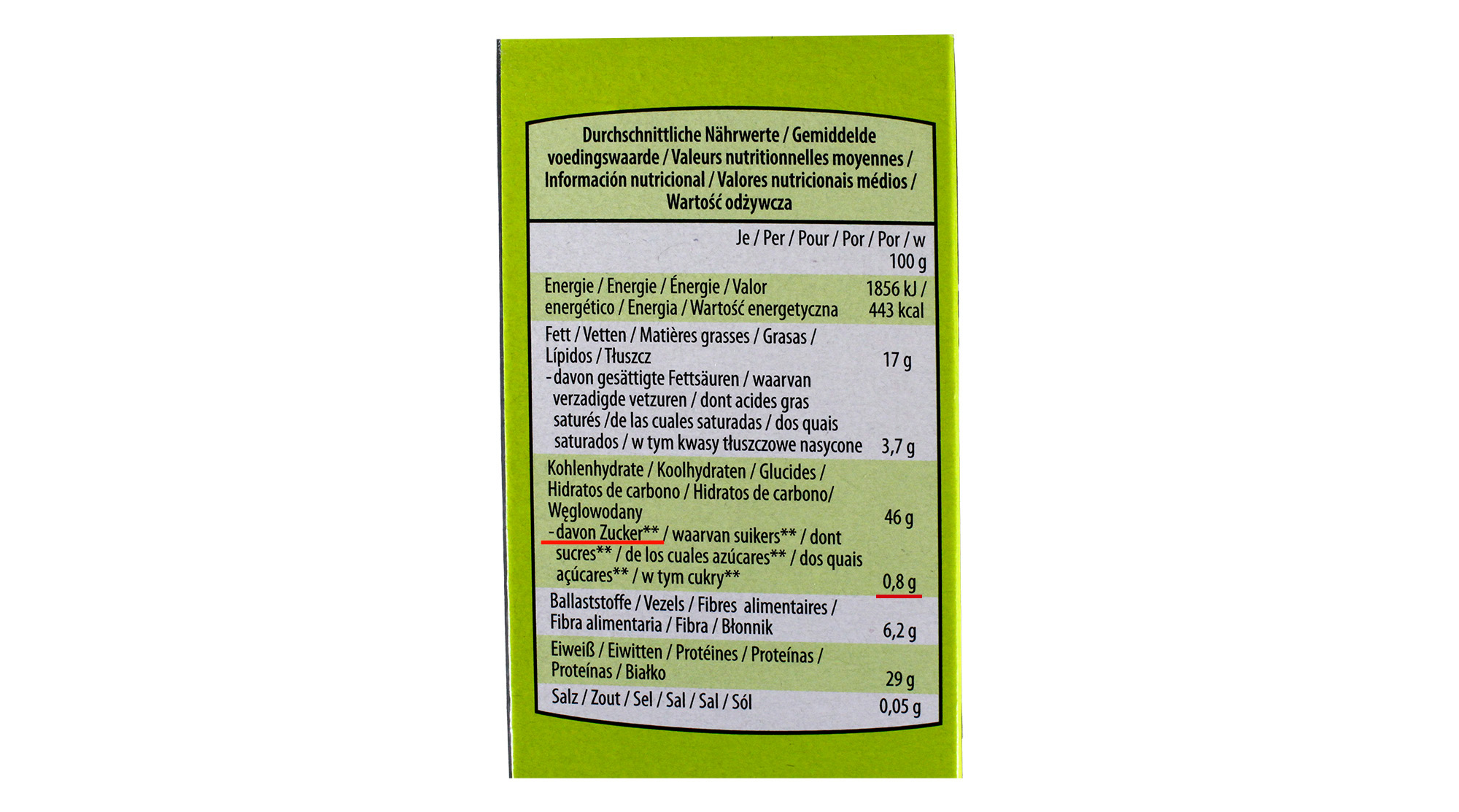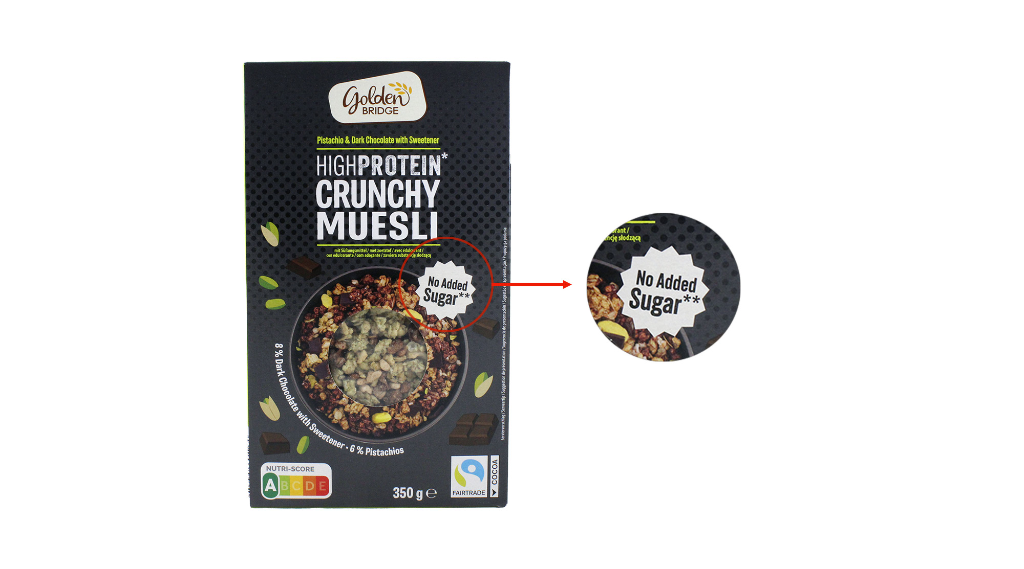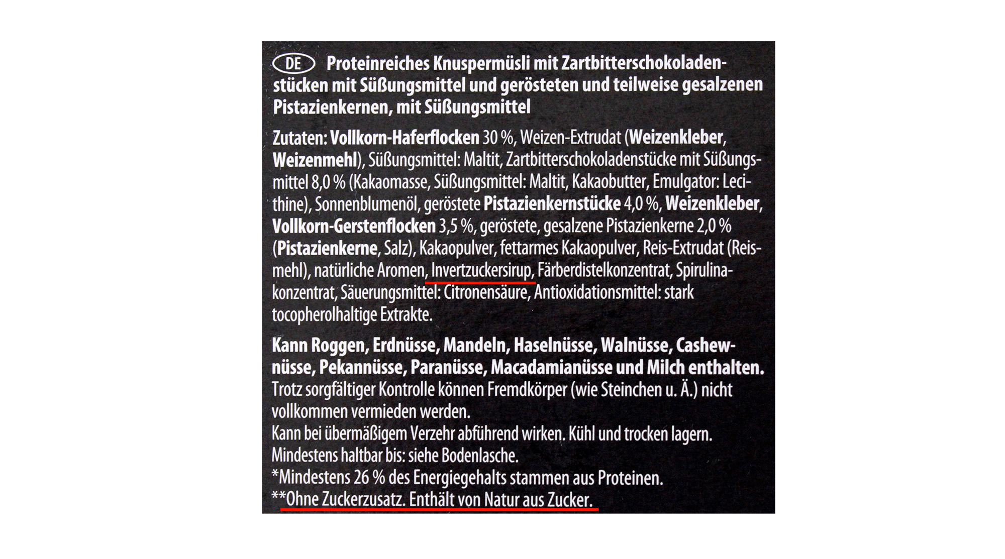 Auf der Rückseite löst der Anbieter die Sternchen auf: „** Ohne Zuckerzusatz. Enthält von Natur aus Zucker“. Die Firma bezeichnet das Produkt als „Proteinreiches Knuspermüsli mit Zartbitterschokoladenstücken mit Süßungsmitteln und gerösteten und teilweise gesalzenen Pistazienkernen, mit Süßungsmittel“. Zusätzlich zu Maltit als Süßungsmittel führt das Zutatenverzeichnis Invertzuckersirup auf. Laut Nährwerttabelle enthält das Produkt 0,8 Gramm Zucker pro 100 Gramm.