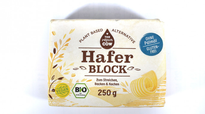 Die Firma The Vegan Cow vertreibt das pflanzliche Streichfett „Haferblock“ in einer für Butter typischen Form und einer Menge von 250 Gramm. Auf der Schauseite sind Haferähren zu sehen und der Hinweis „ohne Gluten“. Die pflanzenbasierte Alternative für Butter bewirbt der Anbieter mit „ohne Palmöl“.