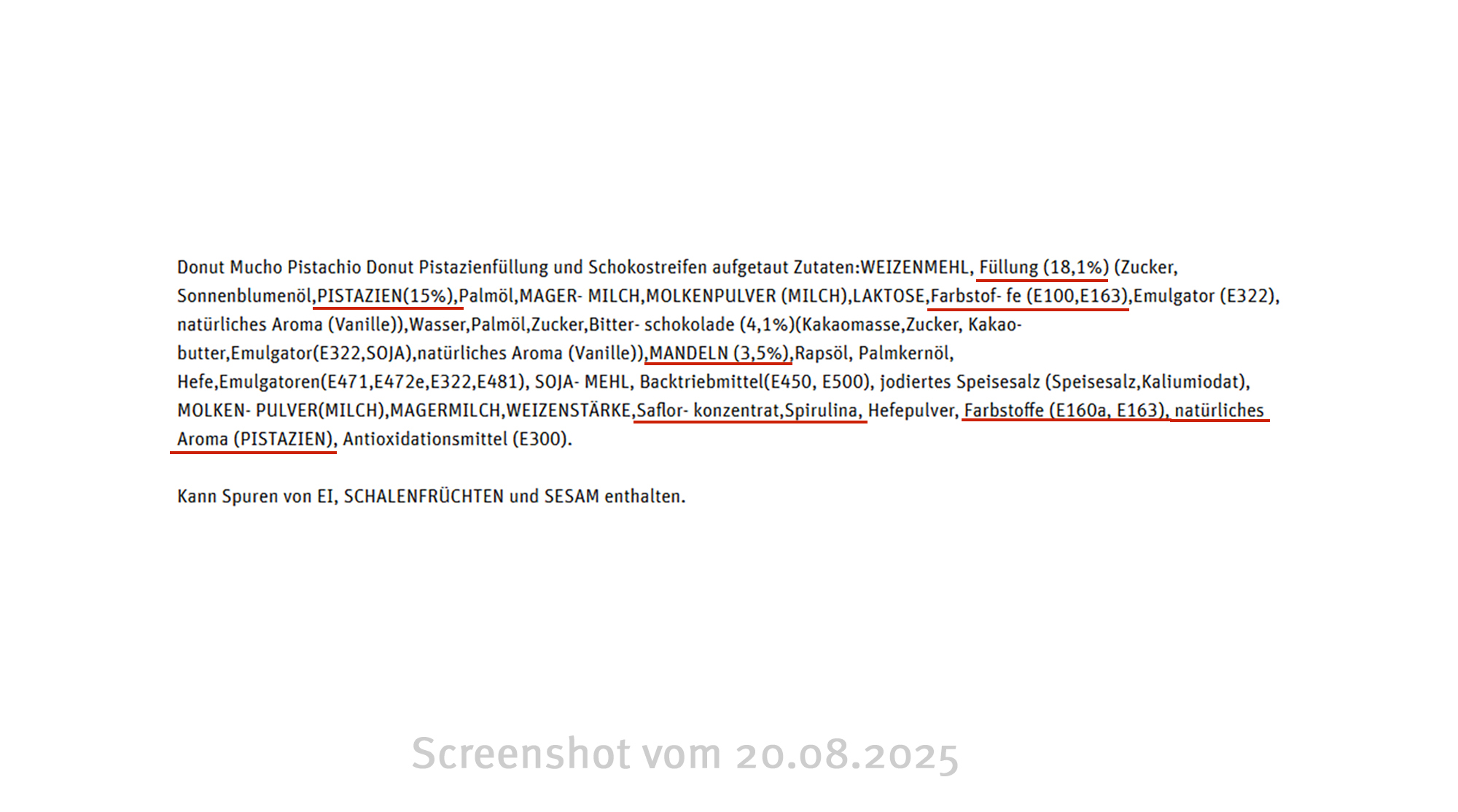 Auf einem Schild am Regal stehen die Bezeichnung „Donut Pistazienfüllung und Schokostreifen aufgetaut“ und die Zutaten in enger Schriftart. Als Zutat der 18 % Füllung sind „Pistazien (15 %)“, entsprechend 2,7 % im Gesamtprodukt, aufgeführt. Ansonsten tauchen Pistazien nur als Geschmacksrichtung von „natürlichem Aroma“ auf. Neben Mehlen, Fetten, Zucker, Mandeln (3,5 %) und anderem mehr stehen die Farbstoffe Kurkumin (gelb), Carotine (orange) und Anthocyane (rot) sowie die stark grün färbenden Zutaten Saflor(Distel)konzentrat und die Alge Spirulina auf der Liste.