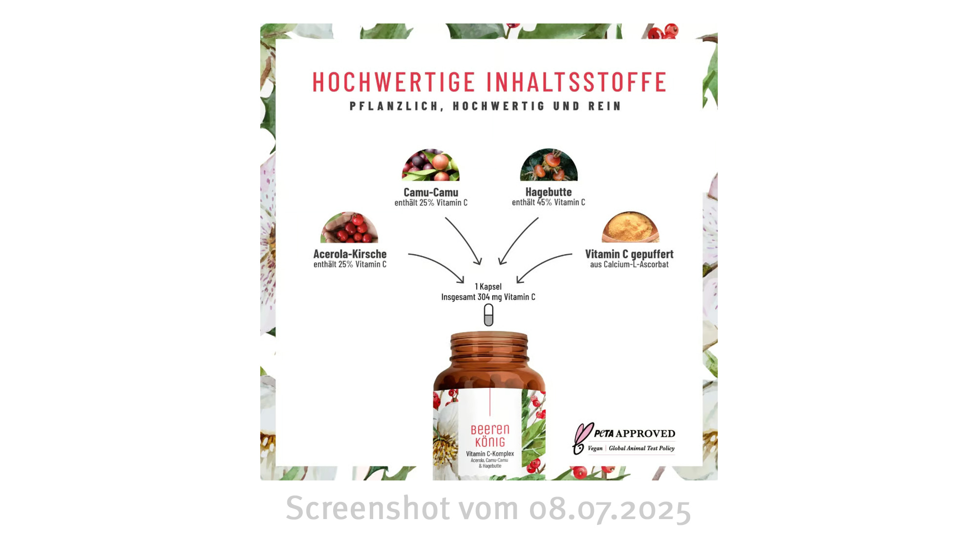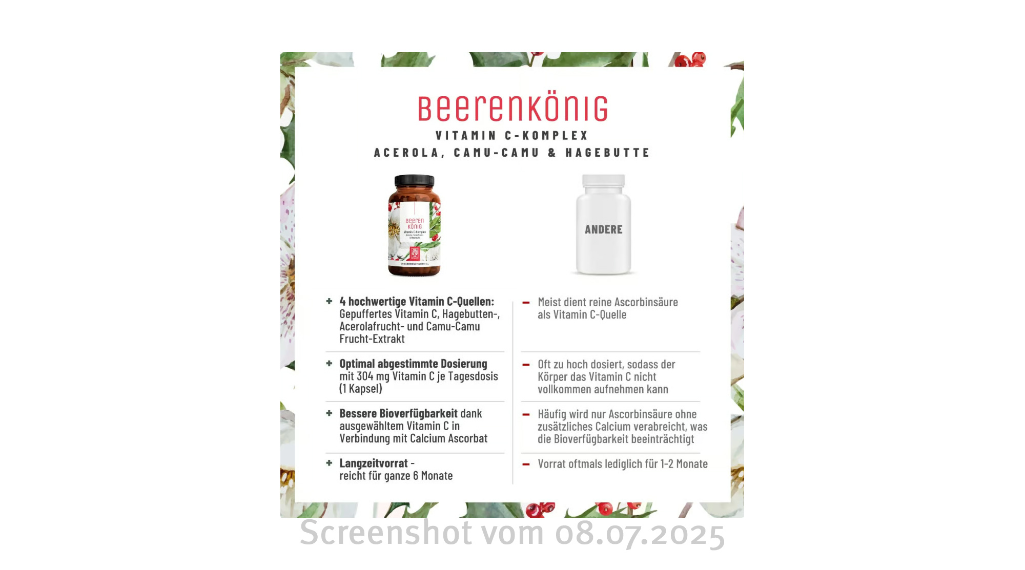 Der Name „Beerenkönig“ sowie die Aufmachung mit Beeren und der Hinweis „Vitamin C-Komplex aus Acerola, Camu-Camu & Hagebutte“ erwecken den Eindruck, das enthaltene Vitamin C stamme hauptsächlich aus natürlichen Beerenquellen. Tatsächlich stammen laut Zutatenliste nur etwa 25 mg der 304 mg Vitamin C pro Kapsel aus den genannten Fruchtextrakten – das sind weniger als 10 %. Über 90 % stammen aus synthetischem Calcium-L-Ascorbat. Ich habe grundsätzlich nichts gegen diese Form von Vitamin C – aber die Irreführung durch Name und Gestaltung ist aus Verbrauchersicht untragbar.