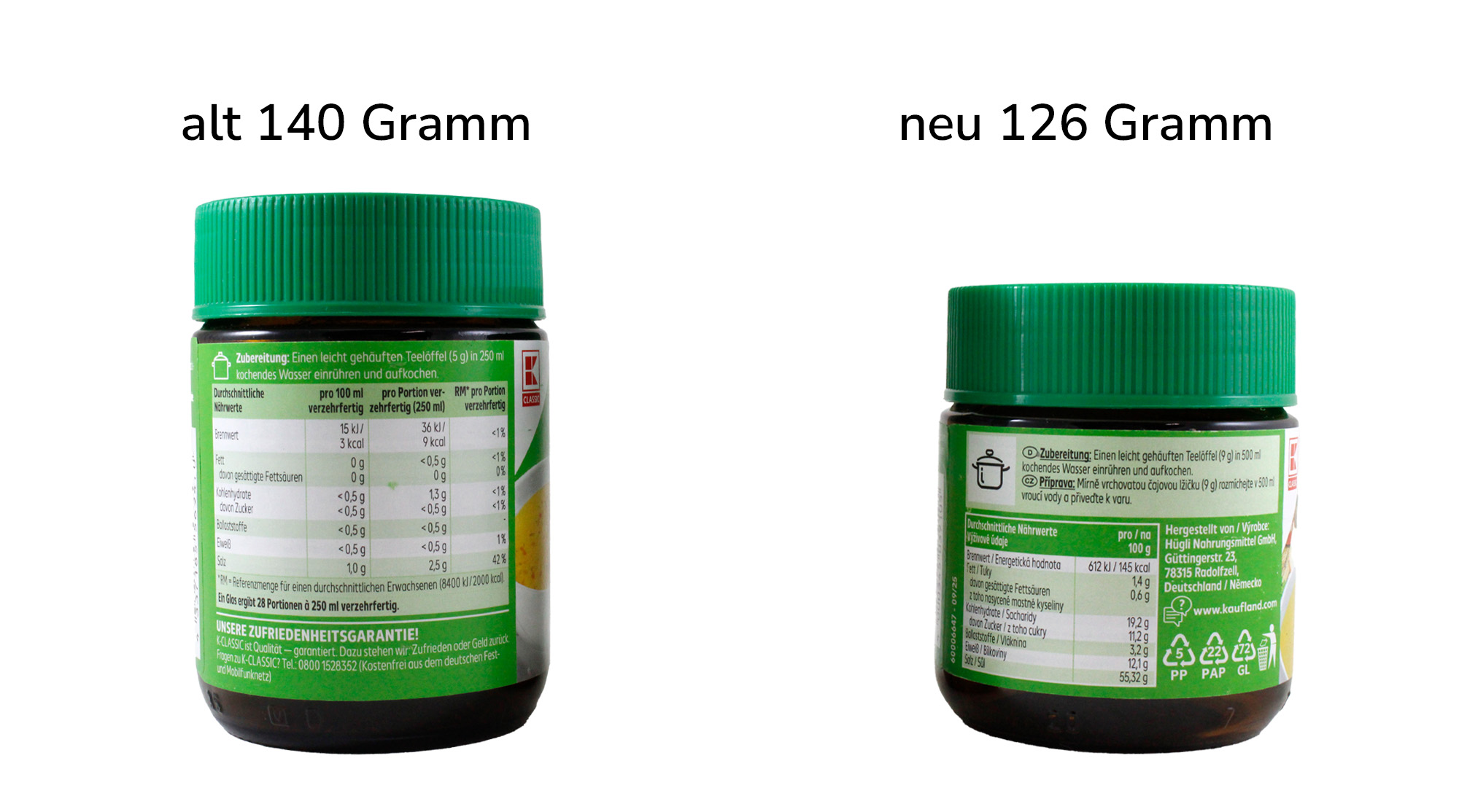 Die Herstellerfirma Hügli hat die Füllmenge der Gemüsebrühe der Kaufland Eigenmarke K Classic von 140 auf 126 Gramm geschrumpft. Ein Hinweis auf die verringerte Menge fehlt. Die aus dem Pulver herzustellende Menge an Gemüsebrühe gibt die Firma unverändert mit „7 Liter“ an. Für die Zubereitung soll nun ein leicht gehäufter Teelöffel für 500 Milliliter statt wie bisher ein leicht gehäufter Teelöffel für 250 Milliliter verwendet werden. Die Menge, die ein gestrichener Teelöffel fassen soll, ist dabei von 5 auf 9 Gramm gestiegen. Die Menge an Pulver für 500 Milliliter Brühe ist hingegen von bisher 10 auf 9 Gramm gesunken.