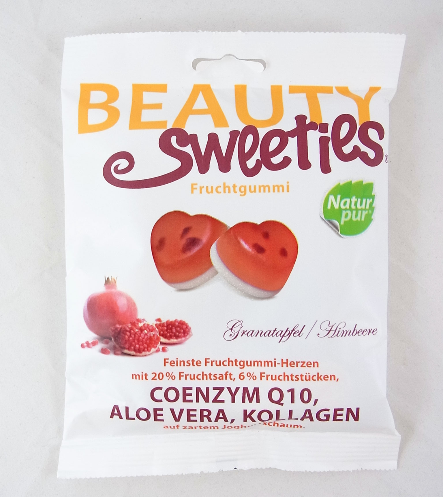 - „In jedem Stück Beauty Sweeties® stecken … und die exzellente Kombination aus Superfrüchten und den Beauty-Zutaten Coenzym Q10, Aloe Vera, Kollagen oder Biotin.“