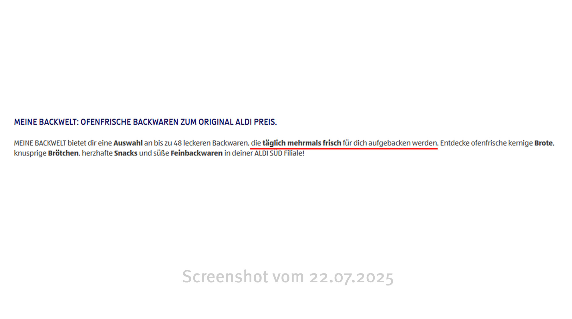 Aldi Süd bewirbt in seinem Angebotsflyer unter der Überschrift „Meine Backwelt Frisch & Lecker“ ein „Bio-Steinofen-Vollkornbrot“. Zusätzlich steht der Hinweis „im Steinofen gebacken“ und „mehrmals täglich frisch gebacken“. In den teilnehmenden Filialen stehen Backautomaten, in denen die Backwaren üblicherweise aufgebacken werden. Ein Steinofenbrot muss ausschließlich auf Stein gebacken werden. Diese Voraussetzung kann ein Aufbackautomat aber nicht erfüllen.