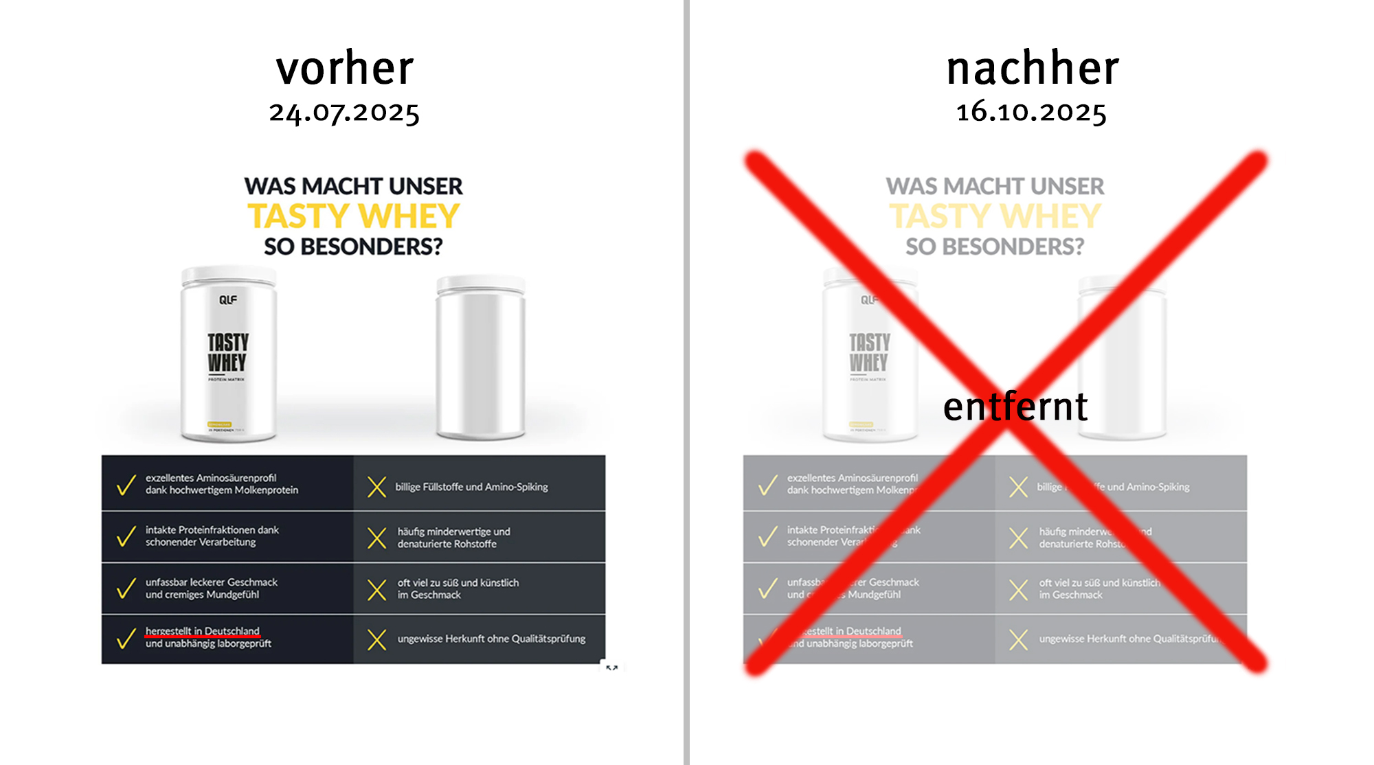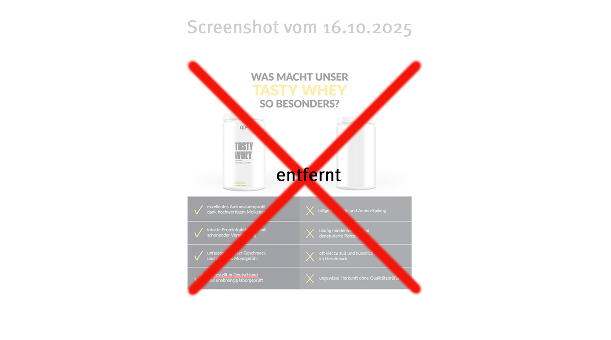 Die Firma hat die Werbung mit „Hergestellt in Deutschland“ und mit „Volactive® Ultra Whey“ für „QLP Tasty Whey“ entfernt.