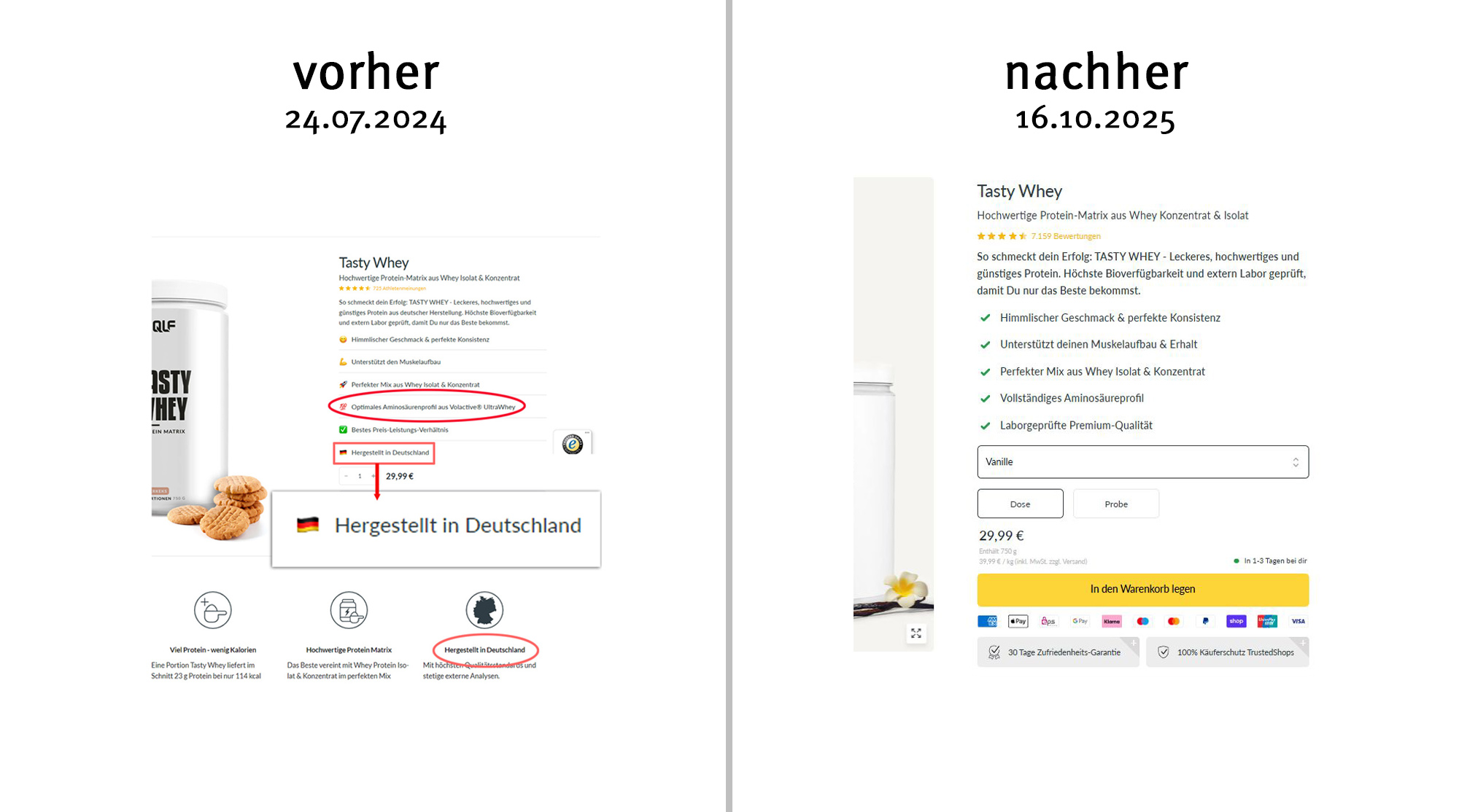 Die Firma FFA GmbH bewarb mehrere Nahrungsergänzungsmittel für Sportler:innen, beispielsweise „QLF Creatin“ und „QLF Tasty Whey“ in ihrem Online-Shop mehrfach mit „Hergestellt in Deutschland“. Stammen die primären Zutaten der Produkte wie das Kreatin und das Molkeneiweiß nicht aus Deutschland, muss die Anbieterfirma dies angeben. Solch ein Hinweis fehlt bei beiden Produktangeboten im Online-Shop. Das verwendete Kreatin kann nach Informationen von Expert:innen aus der Verbraucherzentrale Nordrhein-Westfallen nicht aus Deutschland stammen. Das Molkenweiß für das „QLF Tasty Whey“ bewarb die Firma mit „Volactive® Ultra Whey“, welches nach Angaben der Produktionsfirma in Großbritannien erzeugt wird.