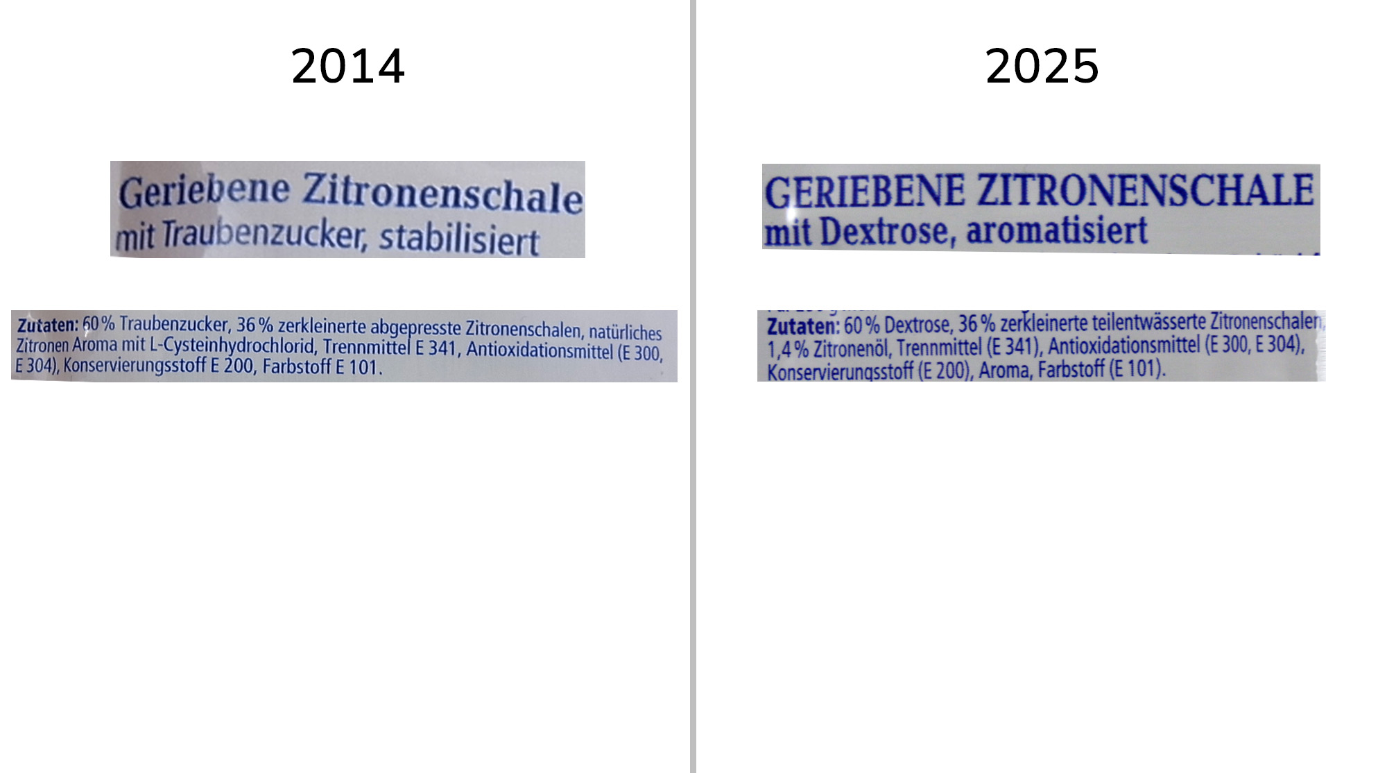 Die „Geriebene Zitronenschale“ von Dr. Oetker enthält nicht nur als Zugabe Traubenzucker und Aroma, sondern ist eine Mixtur aus überwiegend Traubenzucker, Zitronenschale, Zitronenöl, Aroma und fünf Zusatzstoffen. Die Gestaltung der Schauseite verspricht ein weniger verarbeitetes Produkt.