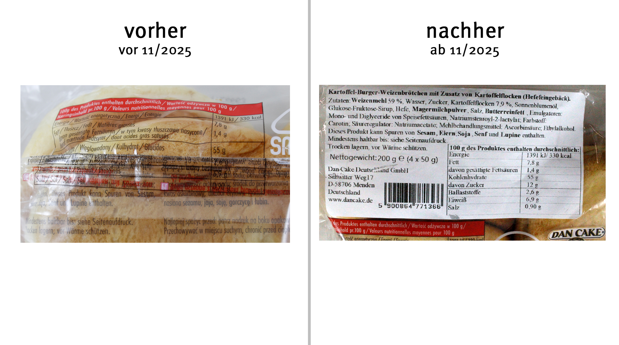 Im Rahmen eines Marktchecks hat die Redaktion von Lebensmittelklarheit im November 2025 die Packungen im Handel geprüft. Alle Angaben sind nun durch ein zusätzliches Etikett gut zu lesen.