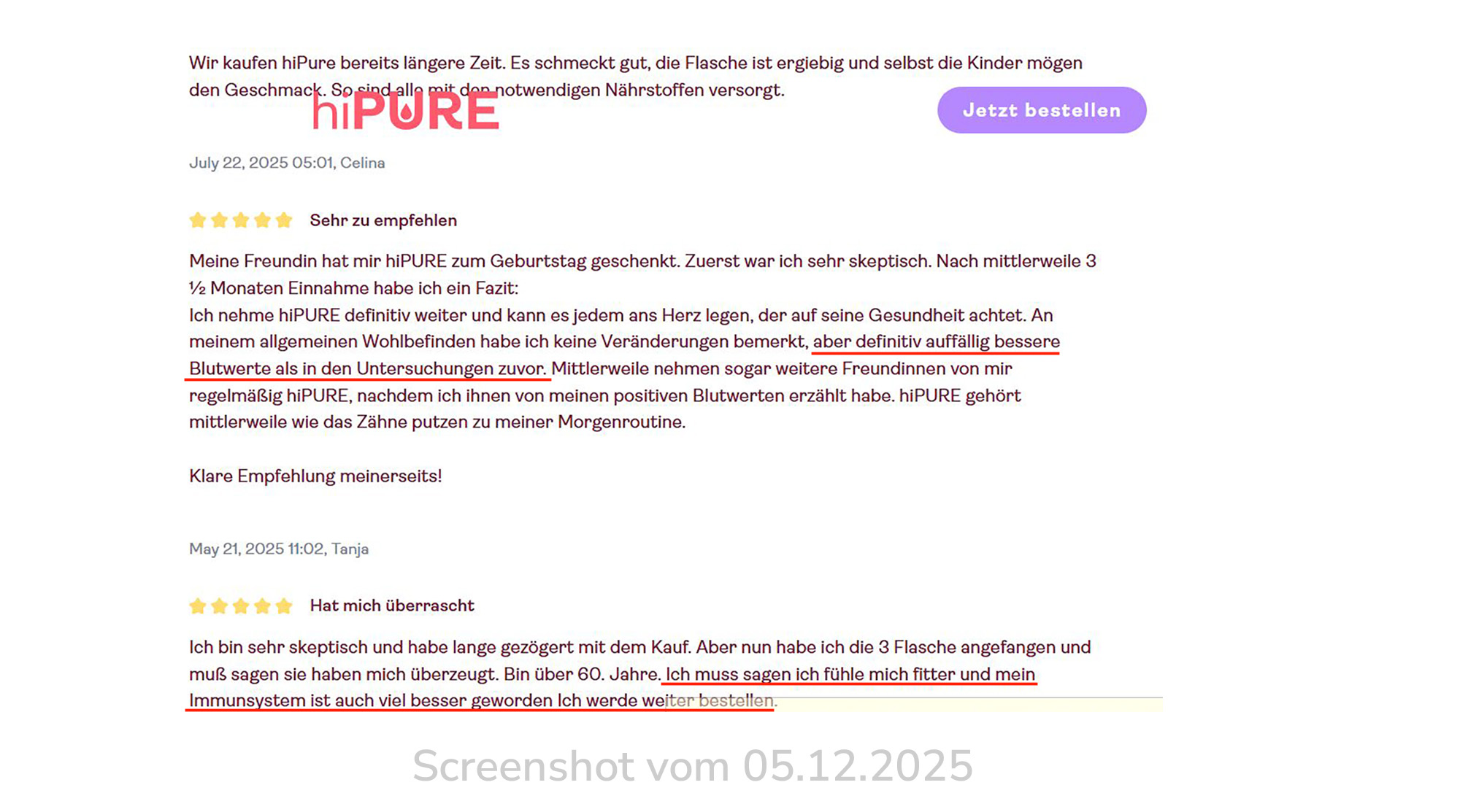 Prominent wirbt der Anbieter mit der Aussage „Bleib gesund“ für das Mikronährstoffkonzentrat Hipure. Dazu finden sich auf der Webseite überwiegend 5-Sterne-Bewertungen für das Produkt. Die positiven gesundheitlichen Erfahrungen stehen dabei im Vordergrund mit Aussagen wie „mein Immunsystem ist viel besser geworden“ oder „nicht mehr ernsthaft krank“. So entsteht der Eindruck, dass das Produkt Krankheiten vorbeugen kann. Alle Aussagen, dass Lebensmittel Krankheiten vorbeugen oder heilen, sind für Lebensmittel leere Versprechungen und deshalb nicht erlaubt.